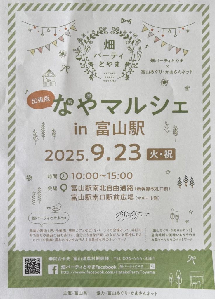 ◯富山駅なやマルシェ 2025年9月23日 最終更新日時 : 2025年11月20日 muscat2 今週9月23日(火)祝日富山駅にてなやマルシェがあります♪富山県内の農産物や加工品など、農家さんの農作物がたくさん並びます♪遊びに見に行ってみてくださいませ。ぶどう園もいつか出店したいですね(^-^)/
